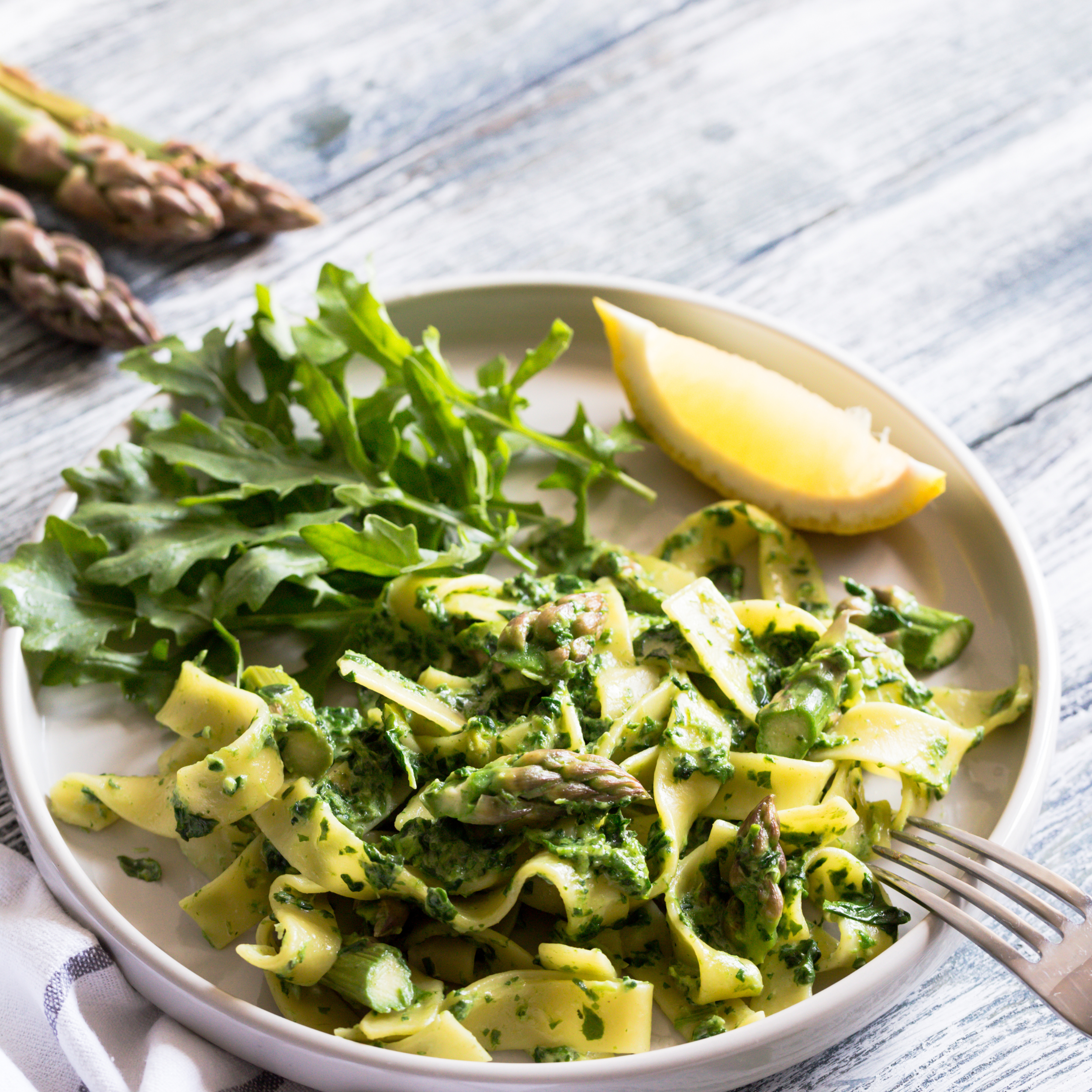 Heat remaining 1 tablespoon olive oil in a separate pan over medium heat. Add asparagus; cook and stir in hot oil for 1 to 3 minutes, depending how tender you like it. Add garlic, pepper flakes, and lemon juice; cook for 1 minute. Add cooked pasta, a dollop of pesto, and Parmesan cheese; stir until cheese melts. Add 1 tablespoon reserved pasta water if cheese begins to stick to the pan.